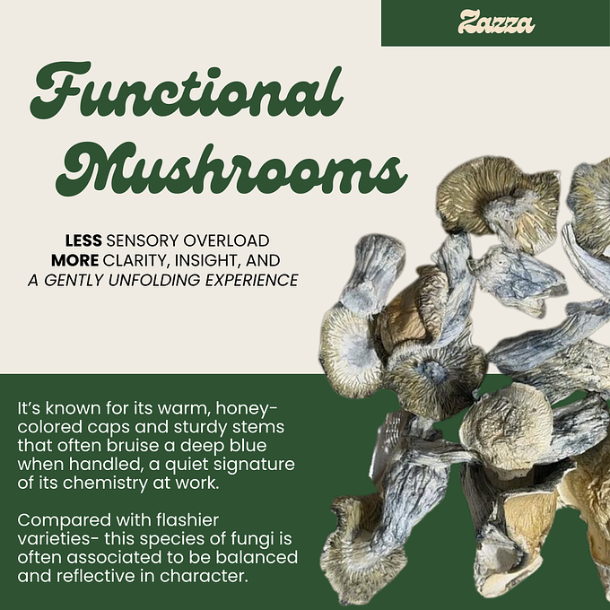 It’s known for its warm, honey-colored caps and sturdy stems that often bruise a deep blue when handled, a quiet signature of its chemistry at work. Compared with flashier varieties. This species of fungi is often associated to be balanced and reflective in character. People associate it less with sensory overload and more with clarity, insight, and a gently unfolding experience—like a conversation that takes its time and actually listens.